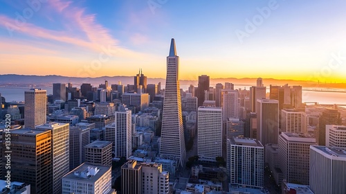 Fototapeta premium Breathtaking Aerial View of San Francisco Skyline during a Colorful Sunset over the Bay : Generative AI