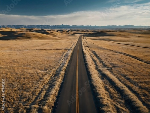 Naklejka premium Breathtaking Aerial View of Winding Road Through Golden Fields and Rolling Hills, Emphasizing Freedom and Exploration with Expansive Blue Sky and Soft Clouds