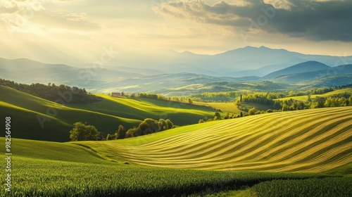 Fototapeta premium Breathtaking agriculture landscape with rolling fields and distant mountains.