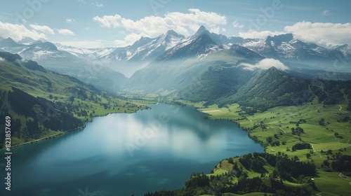 Fototapeta premium Breathtaking Alpine Landscape: Majestic Mountains and Serene Lake. Generative AI