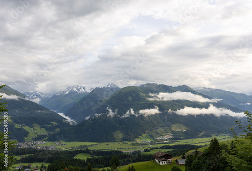 Fototapeta premium Breathtaking alpine valley with low clouds, green slopes, forested mountains, and distant snowy peaks in summer