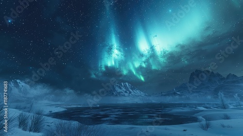 © Kitta Studio, Naklejka premium Breathtaking Aurora Borealis Over Snowy Mountain Landscape at Night