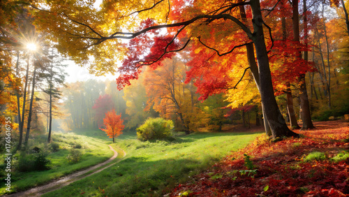 © PhotoPhreak, Fototapeta premium Breathtaking autumn forest path bathed in golden morning sunlight with vibrant red and yellow leaves creating a magical, serene atmosphere for peaceful exploration.