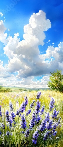 Naklejka premium Breathtaking blooming lavender field under blue sky with fluffy clouds nature...