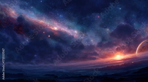 Naklejka premium Breathtaking celestial artwork showcases a vibrant galaxy with swirls of colors, a distant planet bathed in a radiant sunset, and a sky filled with sparkling stars, evoking a sense of wonder and...