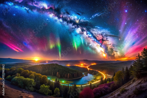 © Arethaawykoff, Obraz premium breathtaking celestial tapestry unfolds in iridescent hues across night sky, illuminating landscape with vibrant colors. scene captures beauty of nature wonders