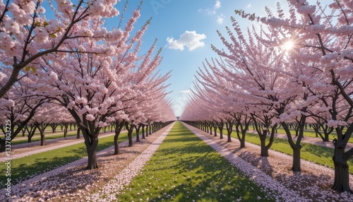 © Kitta Studio, Naklejka premium Breathtaking Cherry Blossom Trees Lined in a Sunlit Field