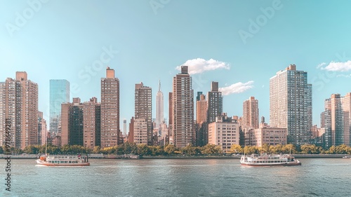© Kitta Studio, Obraz premium Breathtaking city skyline view with modern buildings and serene water, capturing urban beauty and tranquility in vibrant daylight.