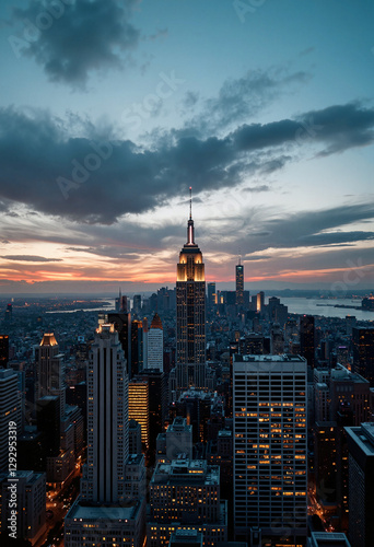 Naklejka premium Breathtaking cityscape at dusk with illuminated skyscrapers, urban beauty