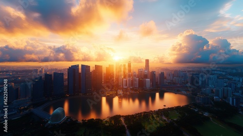 © Chanwit, Fototapeta premium Breathtaking cityscape at sunset featu a skyline of modern high-rise buildings surrounding a tranquil river with colorful clouds overhead