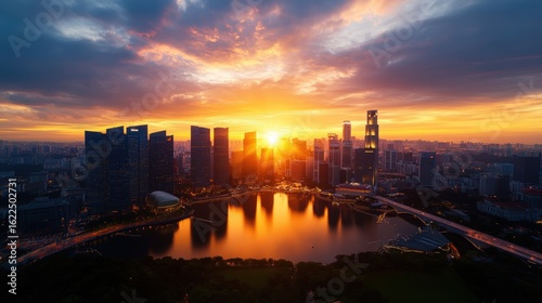 © Chanwit, Fototapeta premium Breathtaking cityscape du sunset with modern skyscrapers reflecting on water skyline horizon