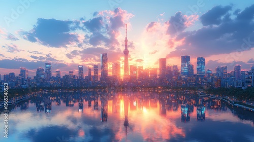 Obraz premium Breathtaking cityscape of tokyo japan at sunset with beautiful reflections in...
