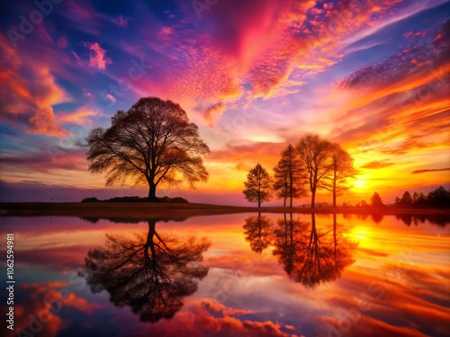 Fototapeta premium Breathtaking Double Exposure of Sunset Over Tree Line with Vibrant Colors and...