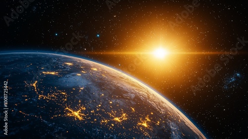 Obraz premium Breathtaking Earth sunrise from space, highlighting city lights and a...