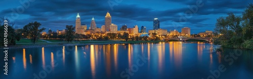 Naklejka premium Breathtaking evening view of Indianapolis skyline reflecting in the water, showcasing city lights and serene nature