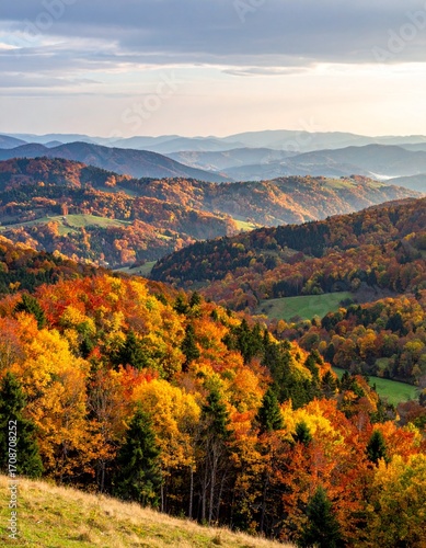© Purnomo, Obraz premium Breathtaking Fall Foliage Background with Copy Space Rolling Hills Panorama