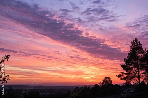 Fototapeta premium Breathtaking gradient of orange to pink to purple hues fills sky as sunset...