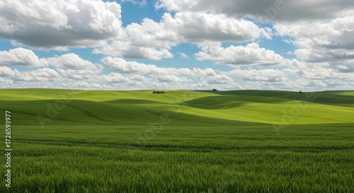Fototapeta premium Breathtaking green fields under a vibrant blue sky with fluffy clouds,...