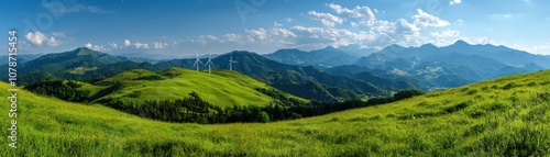 Fototapeta premium Breathtaking green hills under a bright blue sky with distant majestic...