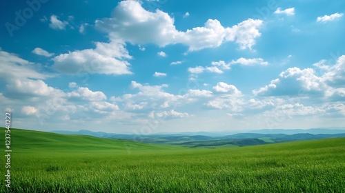 Fototapeta premium Breathtaking Green Meadow Landscape with Clear Blue Sky and Fluffy Clouds :...