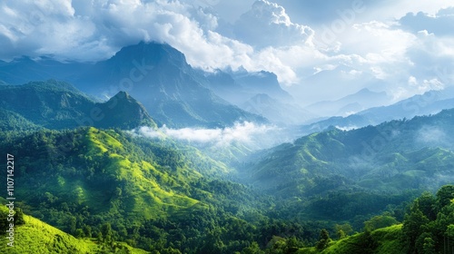 Naklejka premium Breathtaking green mountainscape stretching under cloudy sky