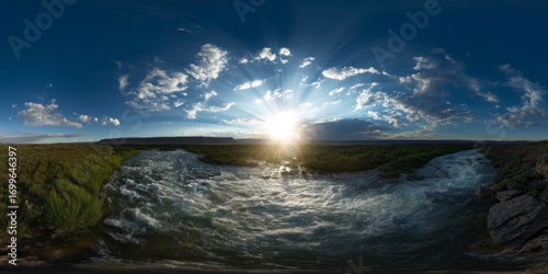 Naklejka premium Breathtaking hdr panoramic view of a sunset over the serene river in nature's embrace