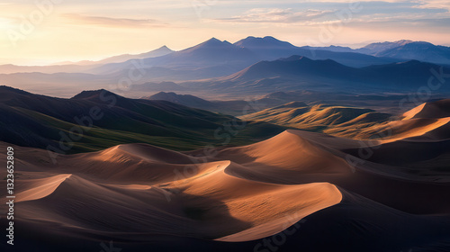 © Worakit, Naklejka premium breathtaking high altitude view of vast desert landscape with rolling sand dunes and distant mountains, showcasing nature beauty