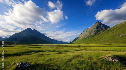 © Generative AI, Naklejka premium Breathtaking Highland Valley with Lush Green Meadows and Dramatic Mountain Peaks Against Blue Sky : Generative AI