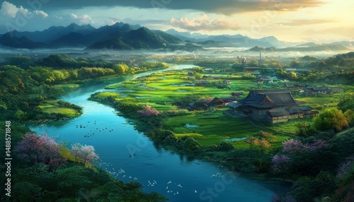 © Maple Stock Photo, Fototapeta premium Breathtaking Japanese Landscape Captured from Above