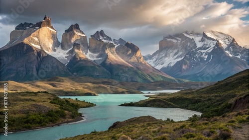 Obraz premium Breathtaking Landscape of Torres del Paine National Park in Patagonia: A Stunning Showcase of Nature’s Majesty, Featuring Mountains, Glaciers, Lakes, and Unique Wildlife