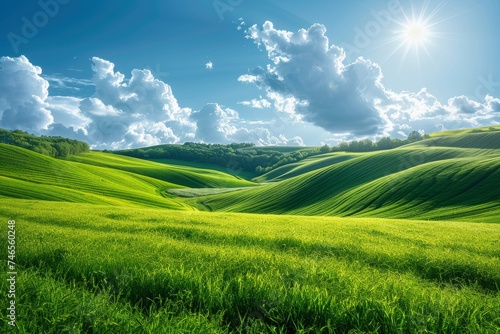 © svastix, Fototapeta premium Breathtaking landscape of vibrant green hills under a clear sky with the sun radiating warmth and light