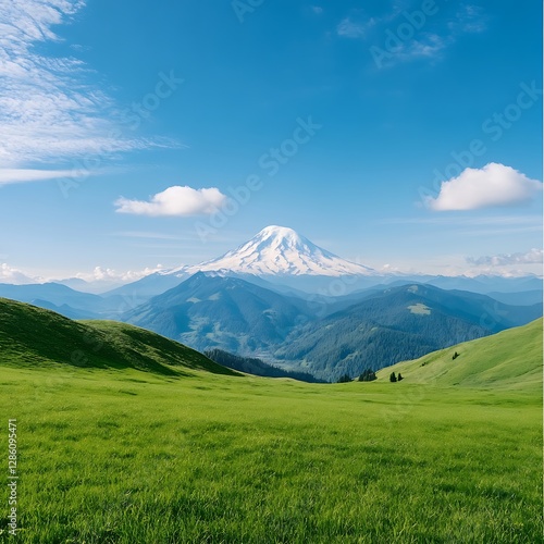 © Finder, Fototapeta premium Breathtaking Landscape with Snow-Capped Mountain and Lush Green Hills under Clear Blue Sky