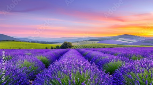 Naklejka premium Breathtaking lavender field under a colorful sunset sky, showcasing vibrant purple flowers and rolling hills in the background.