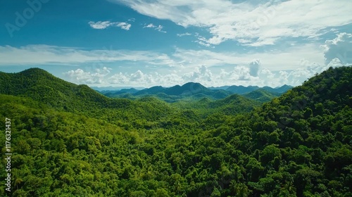 Fototapeta premium Breathtaking Lush Green Forest Landscape with Majestic Mountain Peaks in the Distance