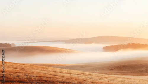 Fototapeta premium Breathtaking misty sunrise over golden fields creates a serene and peaceful landscape perfect for travel, nature, or calming wellness content