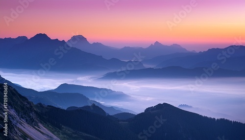 © Jamie, Fototapeta premium Breathtaking Mountain Landscape At Dawn Featuring Layered Peaks Shrouded In Mist With Soft Purple And Pink Sky Illuminating Scene Tranquility Of Nature Evokes Sense Of Peace And Wonder