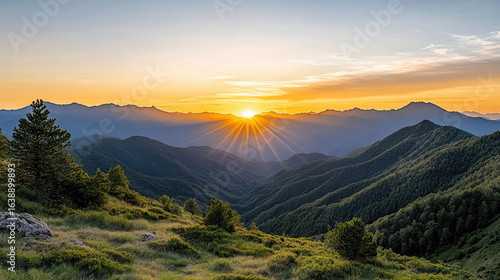 Obraz premium Breathtaking mountain landscape at sunset with vibrant sun rays illuminating...