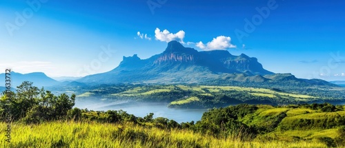 Fototapeta premium Breathtaking mountain landscape under a clear blue sky with lush green hills...