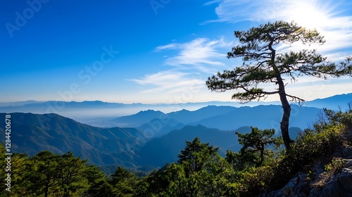 Obraz premium Breathtaking mountain landscape under clear blue sky with lone tree in the...