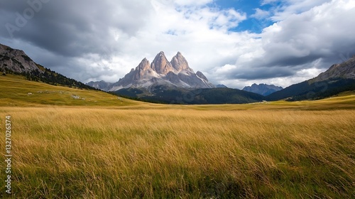 © Generative AI, Fototapeta premium Breathtaking mountain landscape with dramatic clouds above golden grassy fields : Generative AI