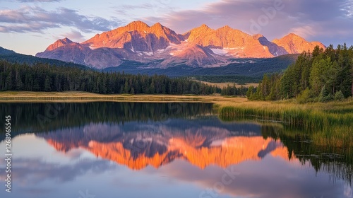 Fototapeta premium Breathtaking mountain landscape with vibrant reflections shimmering on a serene lake, golden sunrise hues, peaceful and majestic scenery.