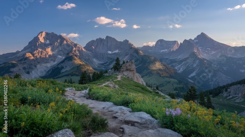 © Kraitong, Fototapeta premium Breathtaking Mountain Landscape with Wildflower Pathway at Sunset