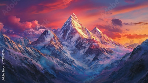 Obraz premium breathtaking mountain range at sunset, glowing vibrant colors, soft light...