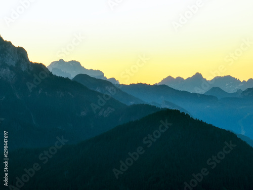 © marina_larina, Fototapeta premium Breathtaking mountain scenery, Dolomites glowing warm sunlight. Peaks rise aerial view, casting dramatic shadows. Atmosphere makes perfect for travel, outdoor adventures, nature appreciation, getaways