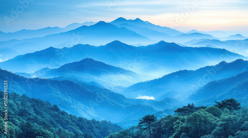 Obraz premium Breathtaking mountain silhouette at dawn, showcasing layers of blue hues and...