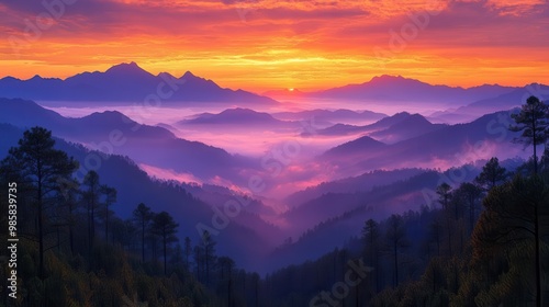 © julija, Obraz premium breathtaking mountain sunrise paints the sky in vivid hues of orange pink and gold majestic peaks silhouetted against the dawning light mistfilled valleys slowly awakening to a new day