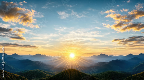 © siraphol, Fototapeta premium Breathtaking mountains at sunrise with vibrant colors and soft clouds create serene atmosphere