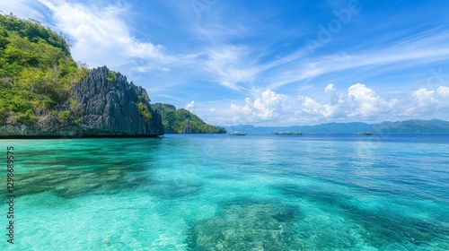© nuanjan, Fototapeta premium Breathtaking ocean view with majestic mountains scenic landscape for travel and nature lovers