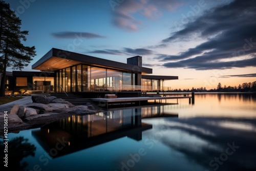 Fototapeta premium breathtaking panorama of a Nordic-designed house, seamlessly blending contemporary architecture with organic elements, accentuated by a pristine swimming pool reflecting the serene sky