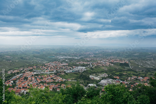 © Dave, Fototapeta premium Breathtaking panorama overlooking San Marino under a cloudy sky